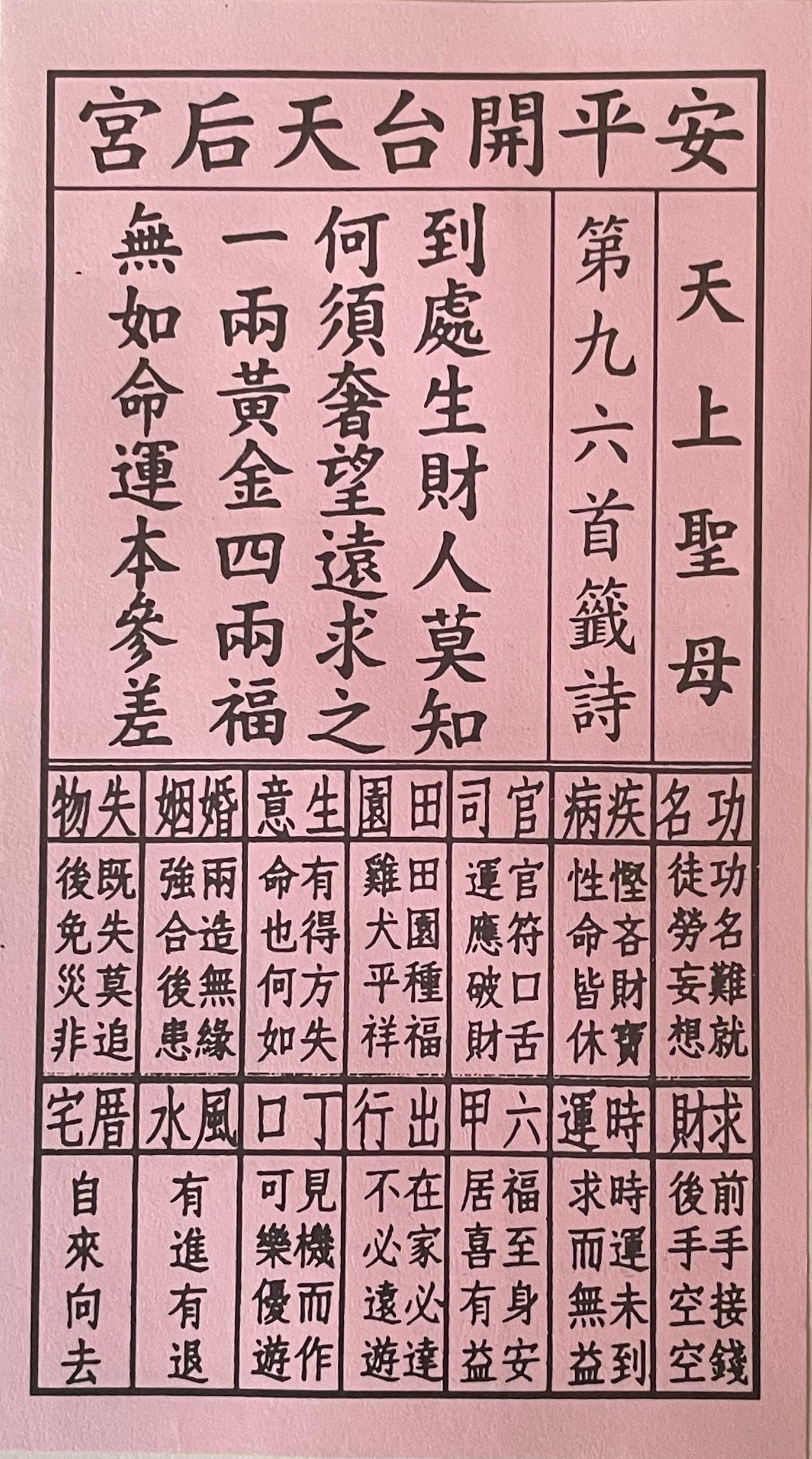 By way of example, here is a divination I received from the Anping Kaitai Mazu temple (安平開台天后宮). The top gives the name of the temple, while beneath is the number of the chhiam (in this case 47), and the verse. At the bottom, there are more specific judgements that reflect various matters, such as fame and success, sickness, official positions, agriculture, marriage and so on.